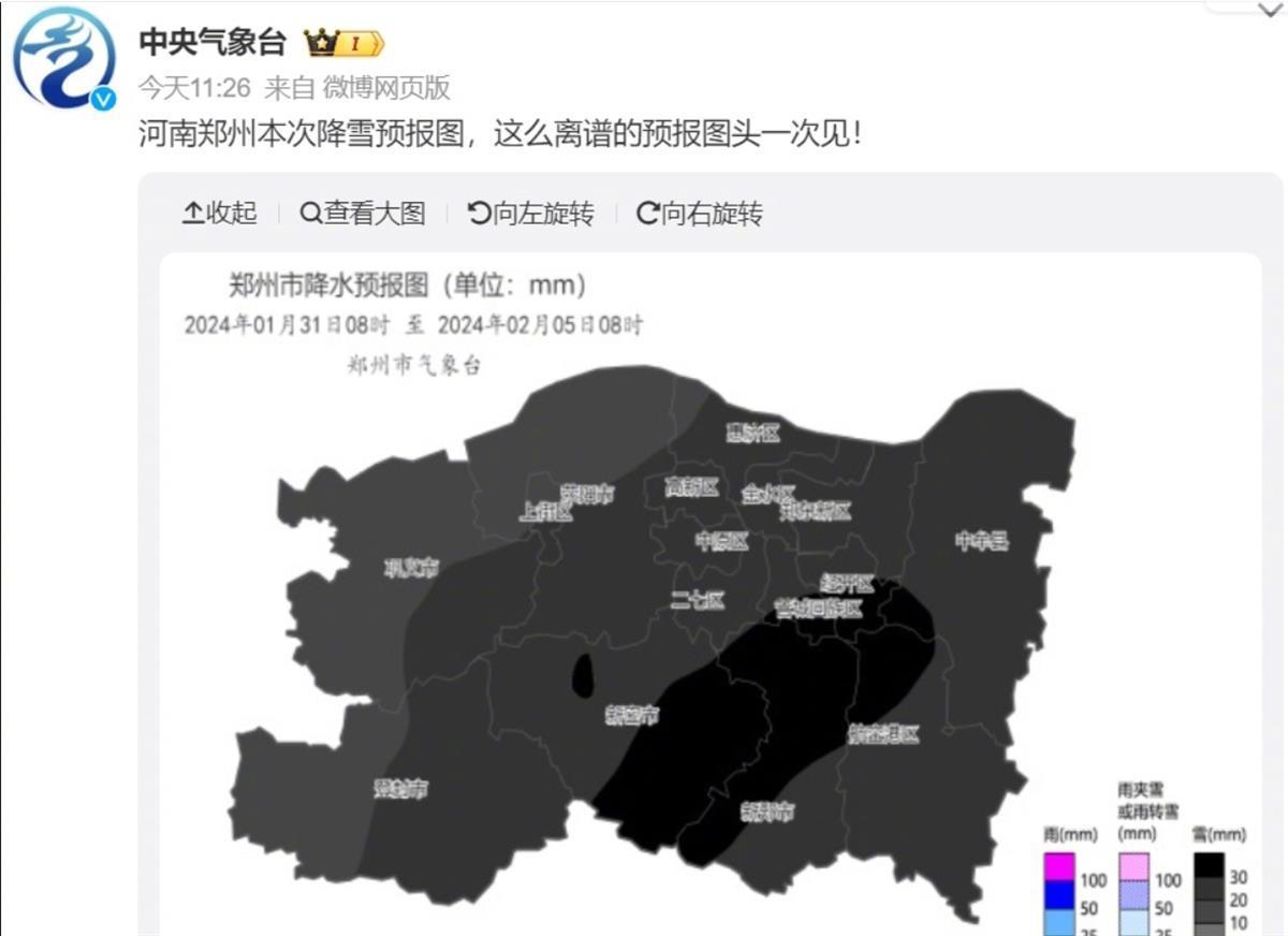 1月30日上午11时,中央气象台官方微博发布了1月31日8时至2月5日8时的郑州市降水预报图。图片显示,整个郑州市区的颜色全是黑的(黑色代表有降雪)。中央气象台官方微博评论称:“河南郑州本次降雪预报图,这么离谱的预报图头一次见! ”