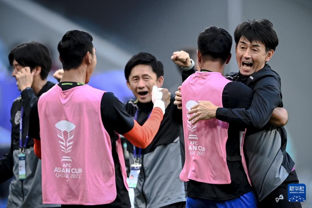 1月30日,泰国队主教练石井正忠(右一)在泰国队进球后庆祝。新华社记者 江汉 摄