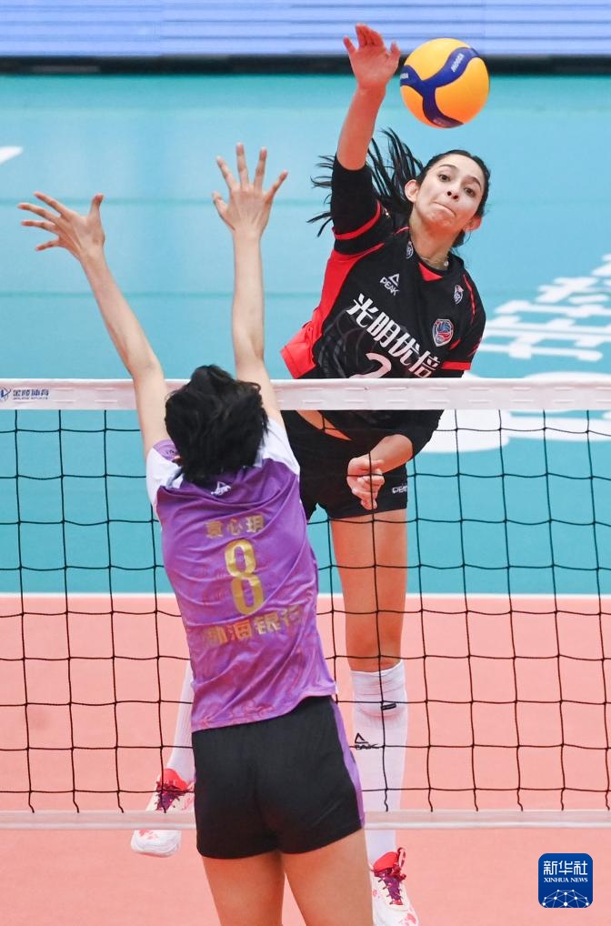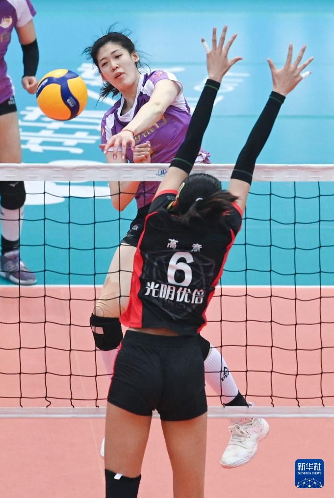 1月30日,上海光明优倍队球员高意(左)在比赛中扣球。新华社记者 赵子硕 摄