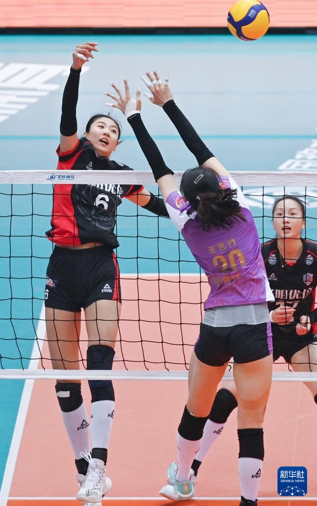 1月30日,天津渤海银行队球员王艺竹(右一)在比赛中扣球。新华社记者 赵子硕 摄