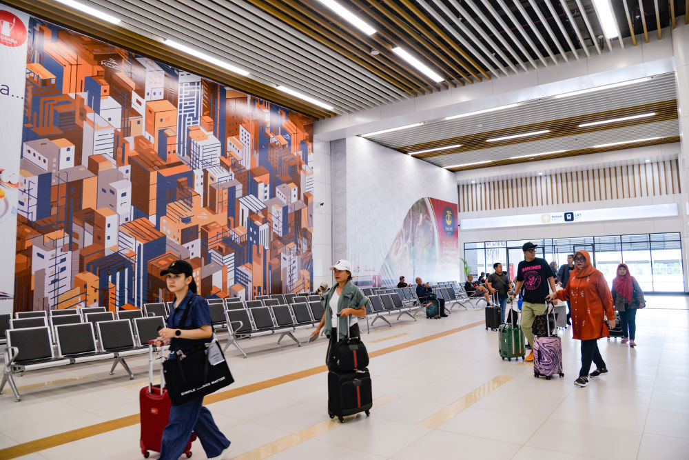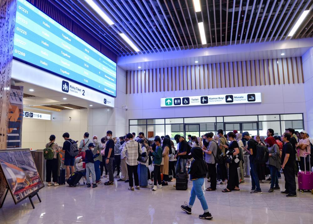↑乘客在雅加达哈利姆站候车大厅排队等候。