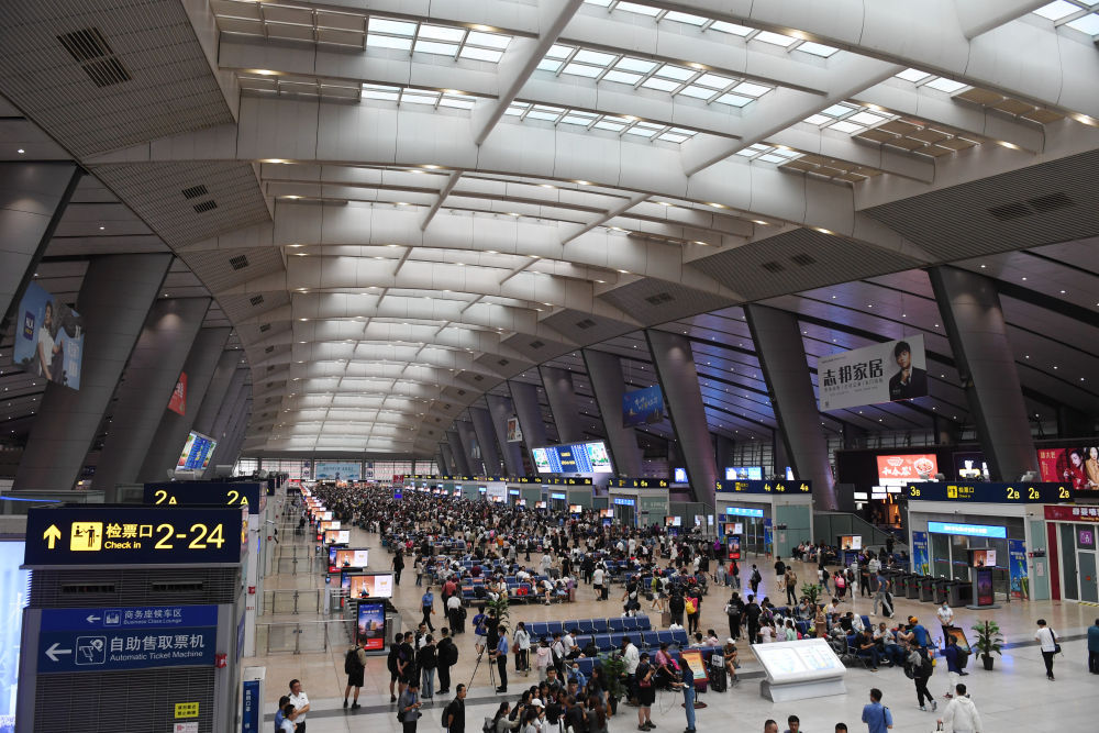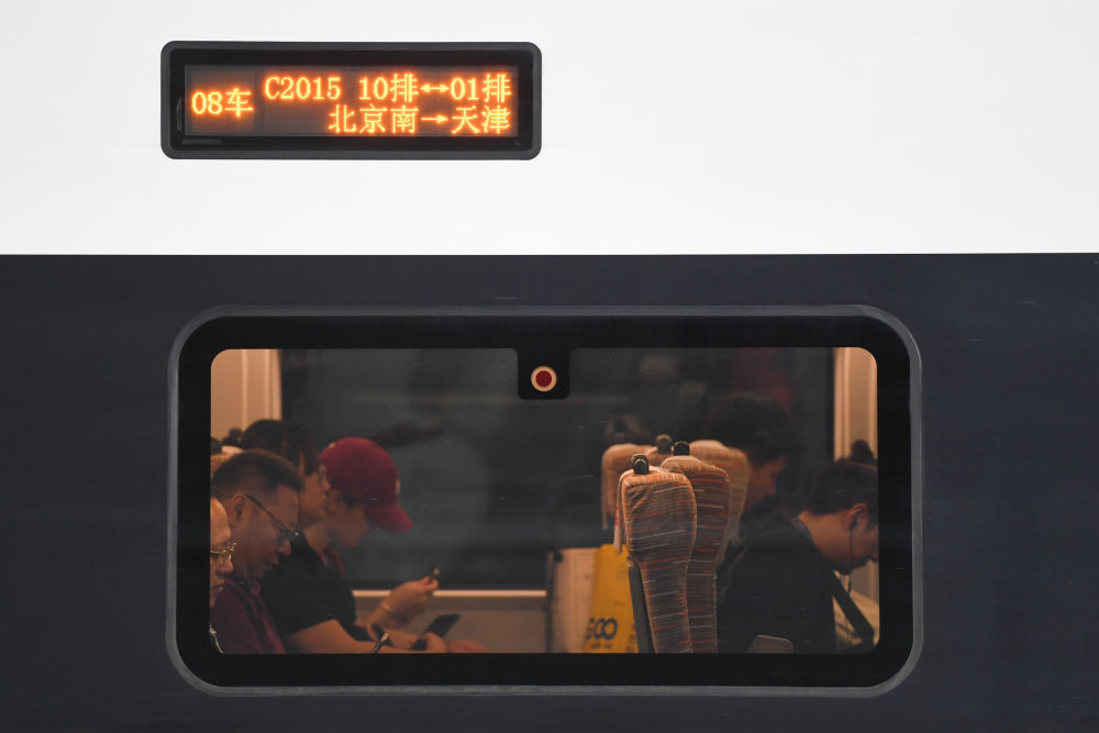 ↑在北京南站,旅客乘坐京津城际列车出行。