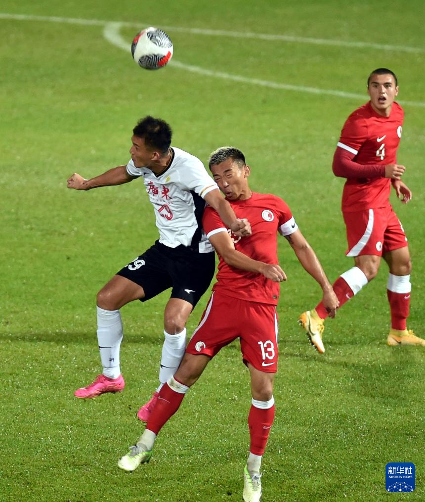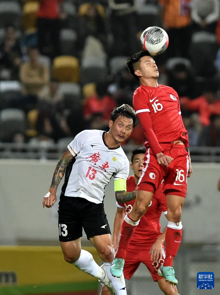 1月31日,香港队球员陈肇钧(右)与广东队球员史亮争顶高球。新华社记者 卢炳辉 摄