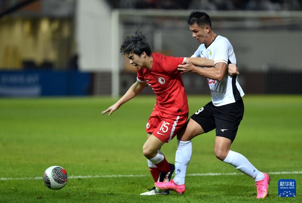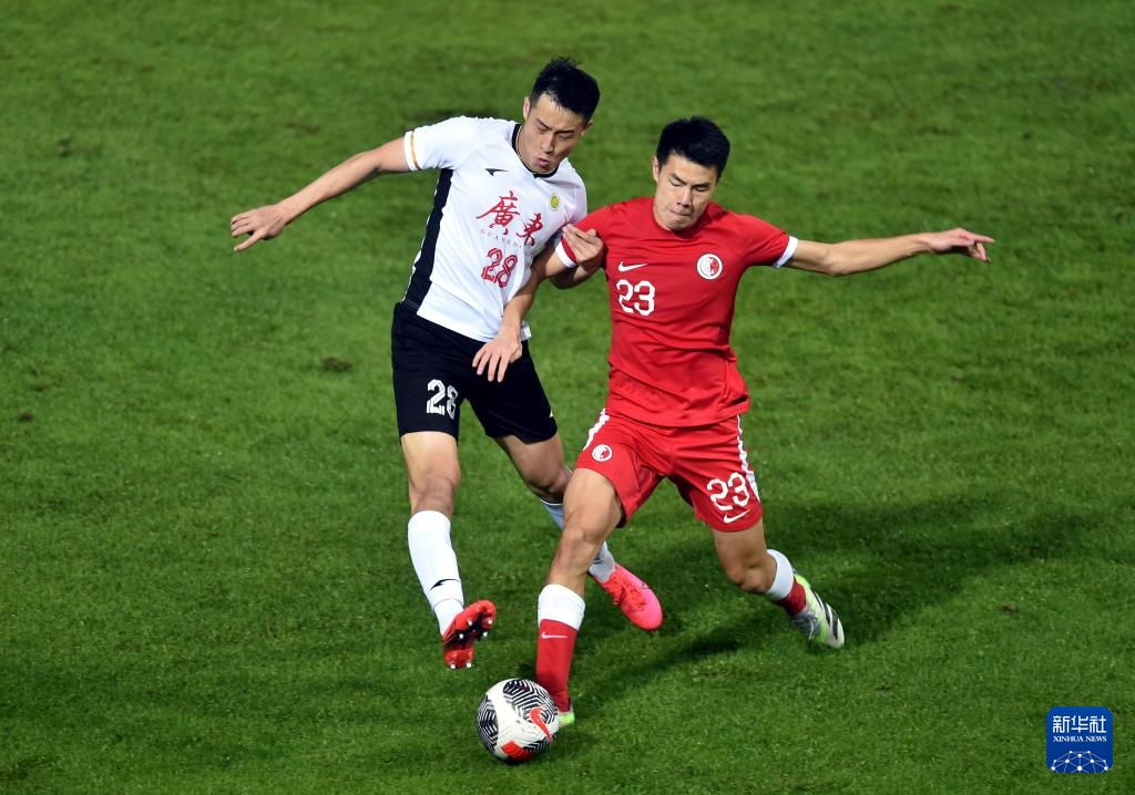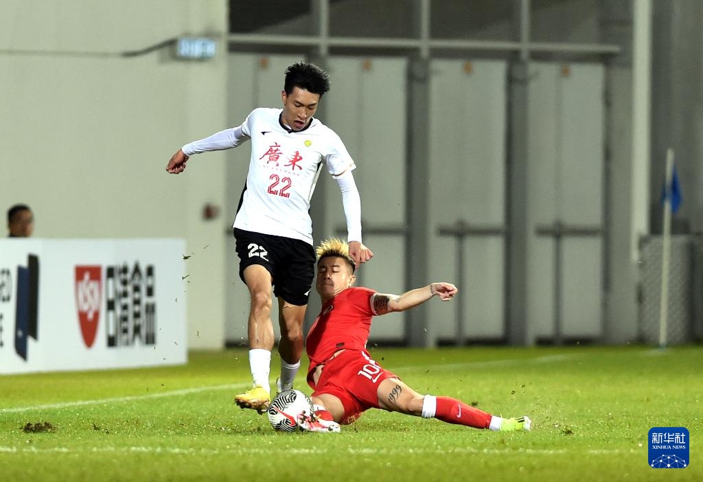 1月31日,香港队球员孙铭谦(右)与广东队球员田子羿拼抢。新华社记者 卢炳辉 摄