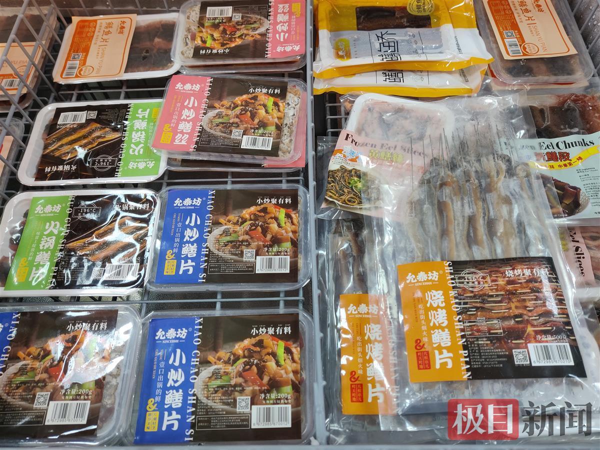 清朝时期,鳝鱼粉就是家喻户晓的风味早点,后来黄鳝成为当地人饭桌上的重要美食,研制出粉蒸鳝鱼、泡蒸鳝鱼、爆炒鳝丝等一百多种做法。不过,黄鳝虽然美味,却不易处理,以往大部分黄鳝都用于水产交易,1月底,极目新闻走访仙桃市场时发现,速食类仙桃鳝鱼粉、小炒鳝丝预制菜、香辣鳝片小零食等逐渐受欢迎,成为春节年货新宠。