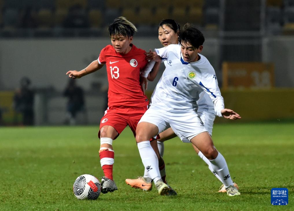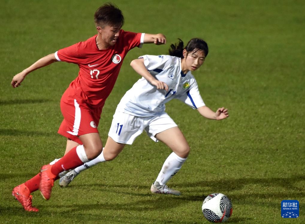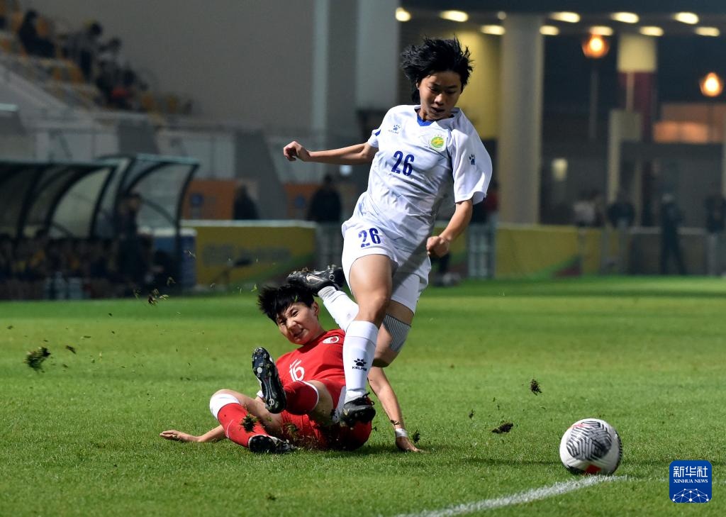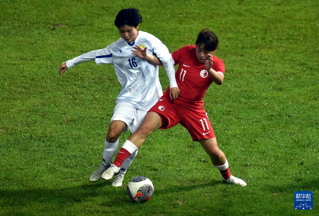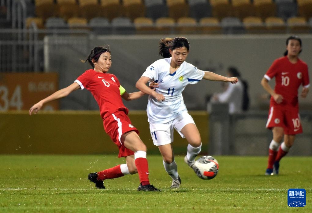 2月1日,广东队球员何晴茵(左)与香港队球员关詠瑜在比赛中拼抢。新华社记者 卢炳辉 摄