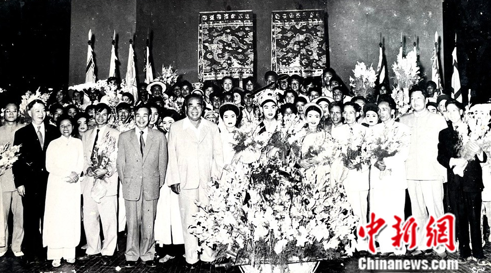 1960年,越南代表团访演上海,中国领导人和梅兰芳(左二)与代表团合影留念。越南河内电影和戏剧大学电影和戏剧研究所图书馆 供图