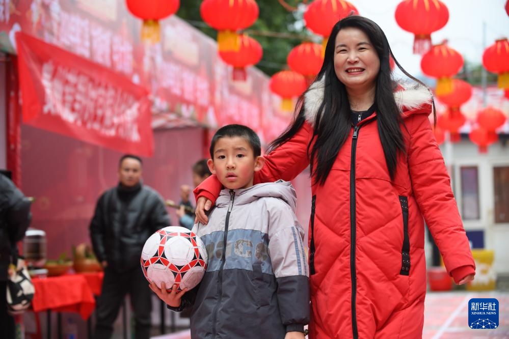 2月2日,在“村超村晚”年货大集市,一个小男孩怀抱足球“赶集”。新华社记者 刘续 摄