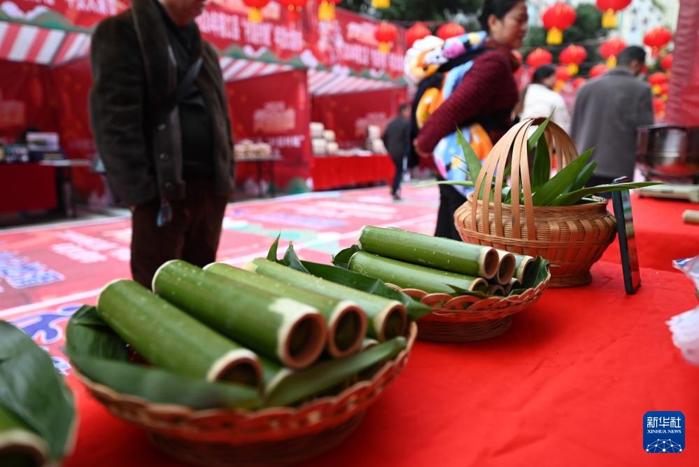 这是在“村超村晚”年货大集市上售卖的特色美食竹筒饭(2月2日摄)。新华社记者 刘续 摄