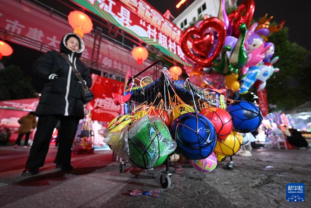 2月2日,商贩在“村超村晚”年货大集市外售卖足球。新华社记者 刘续 摄