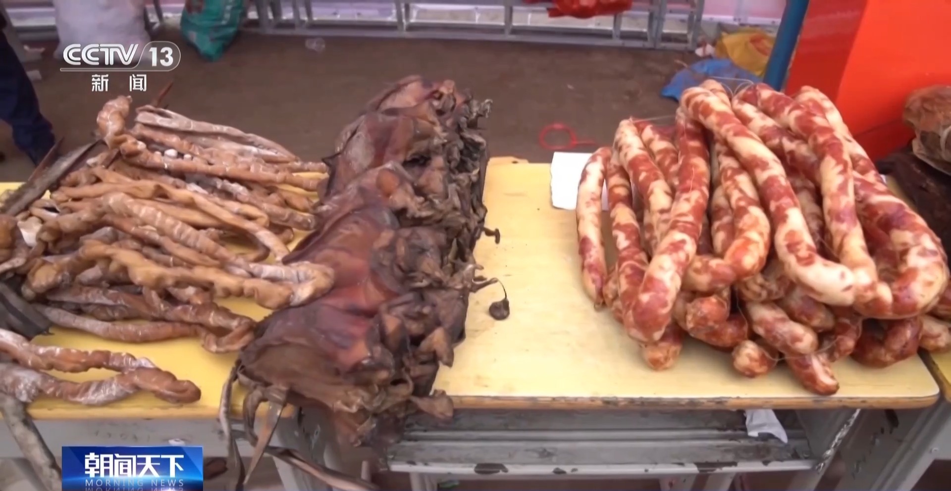 商贩 刘军:好多人都回来过年了,这都是咱们自己煮的肉,年年都有回头客。
