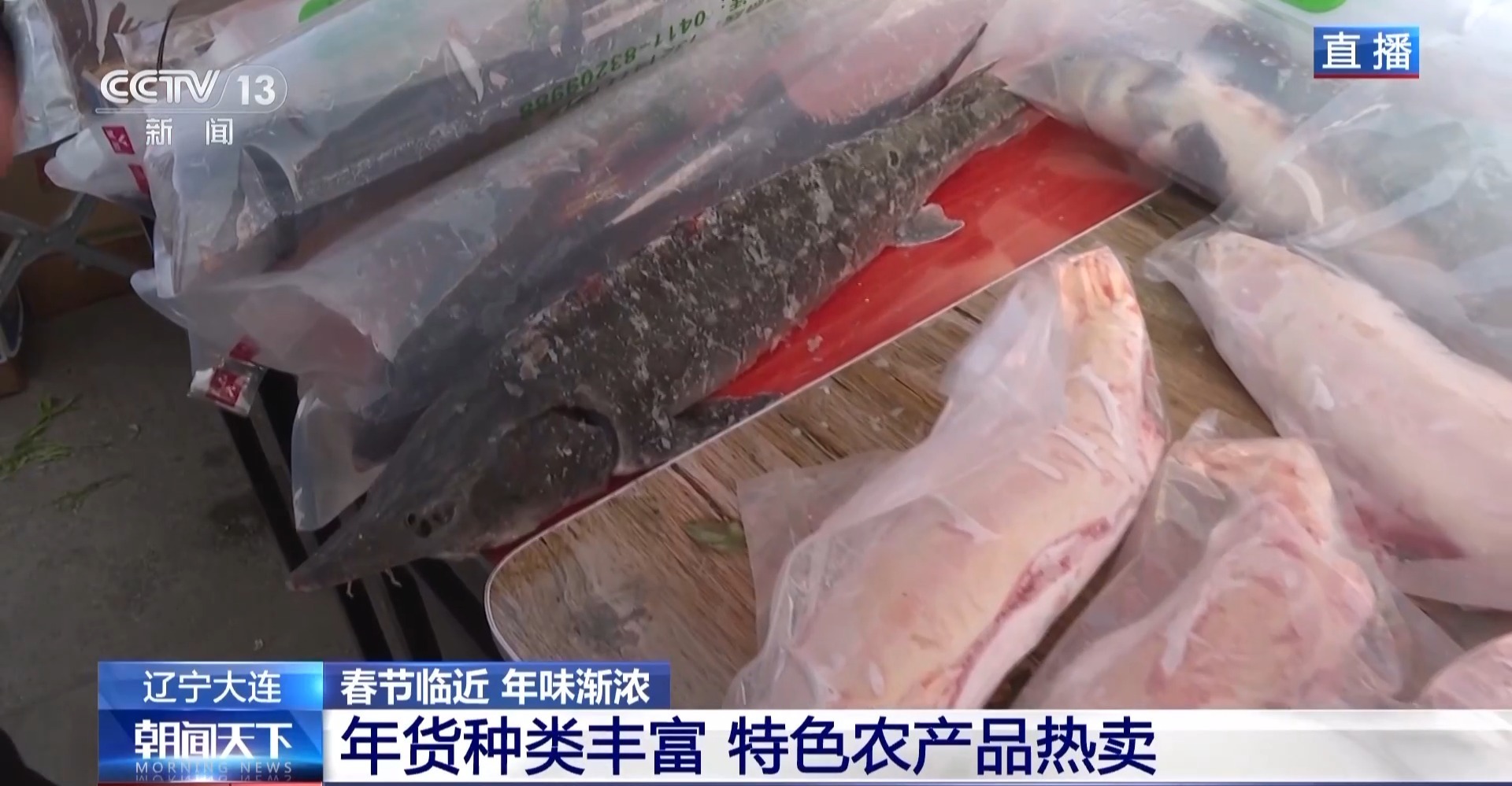 总台记者 陶泽文:大连是海边的城市,这里的大集自然少不了的就是各类海鲜,还有冻的裙带菜、海带。给大家推荐安波的鲟鱼,个大肉紧,味道鲜美,营养丰富,过年咱们都讲究年年有鱼。不少人都来安波大集采购鲟鱼,作为春节餐桌上的一道佳肴。