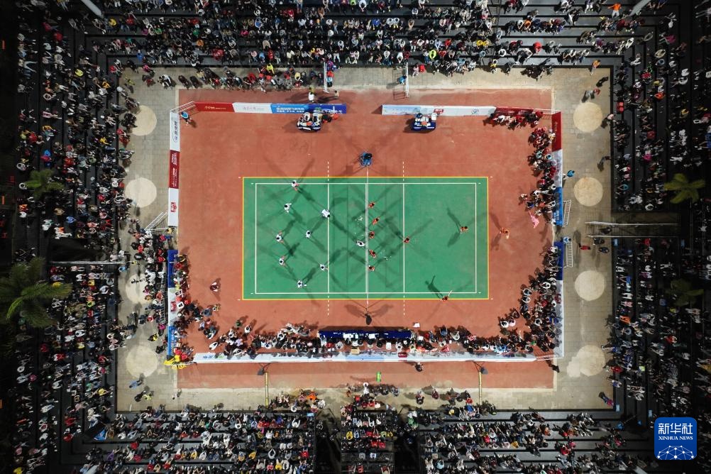 2月2日,海南文昌村镇排球迎春赛在文昌市文城镇玉阳公园举行(无人机照片)。新华社记者 张丽芸摄