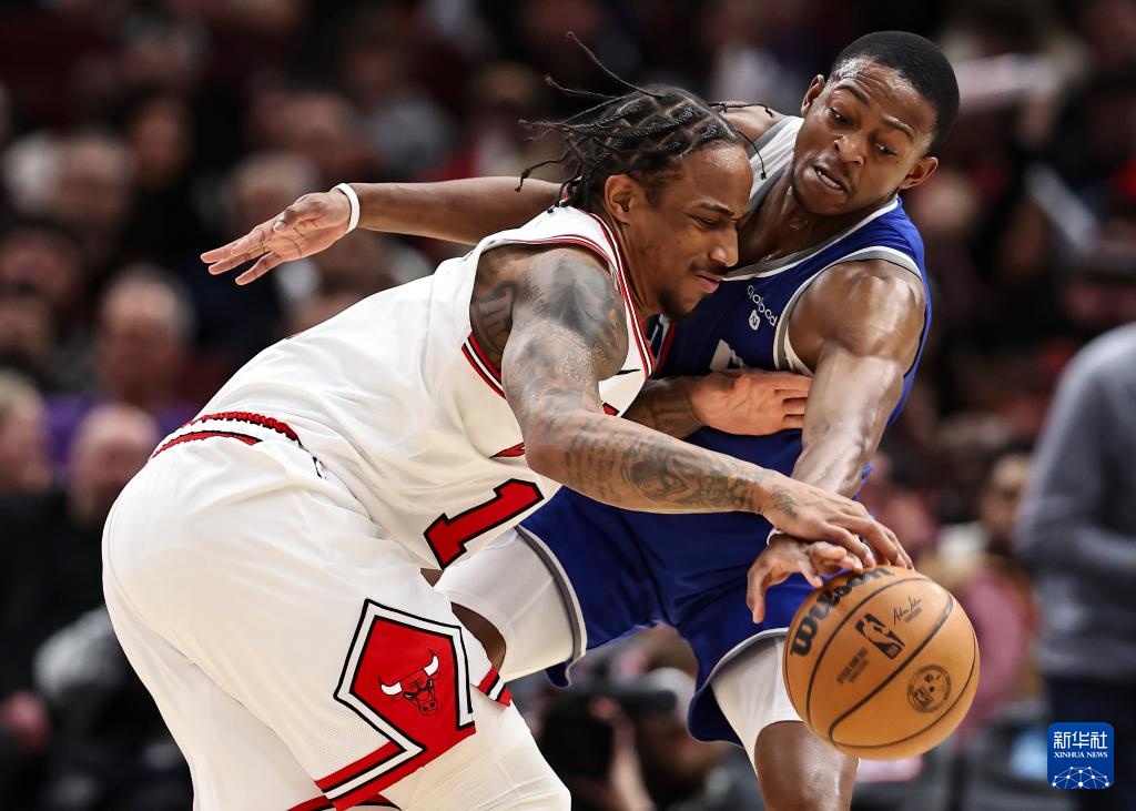 2月3日,公牛队球员德罗赞(左)与国王队球员福克斯在比赛中拼抢。新华社发(乔尔·莱纳摄)