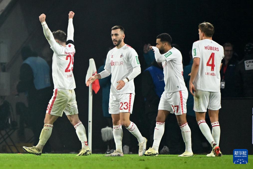2月3日,科隆队球员蒂尔曼(左一)在进球后庆祝。新华社发(乌尔里希·胡夫纳格尔 摄)