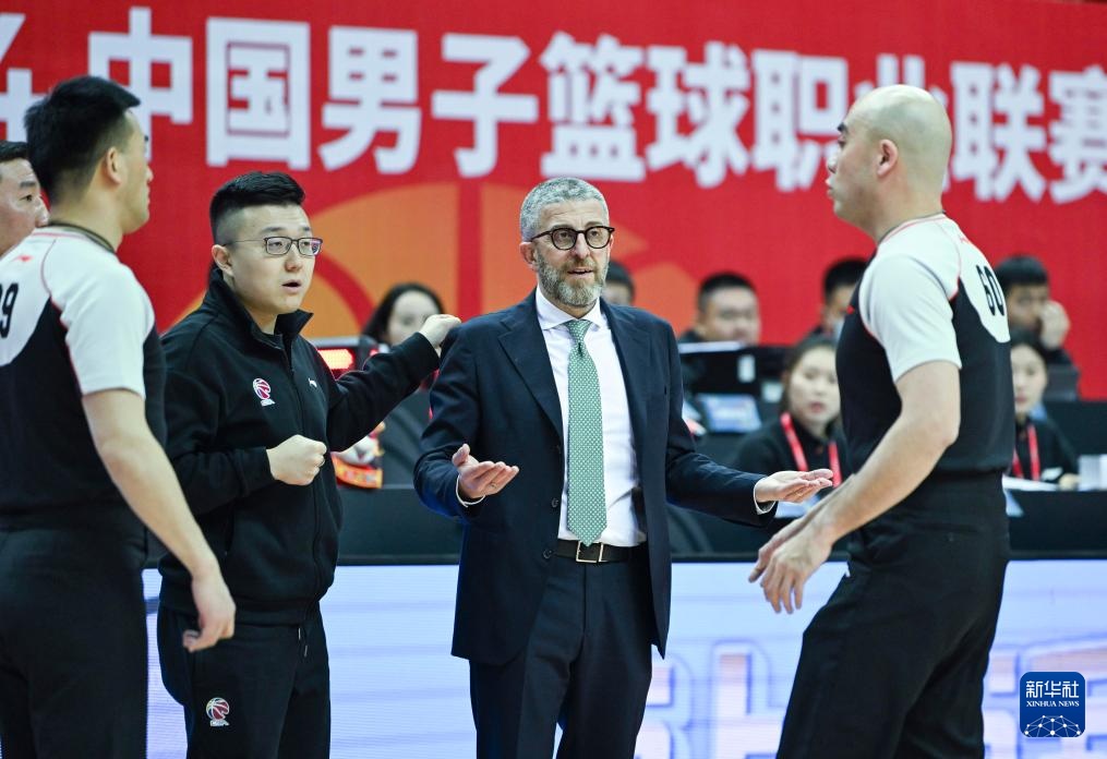 2月3日,北京北汽队主教练乔里欧(右二)在比赛中与裁判交流。新华社发(王须中摄)