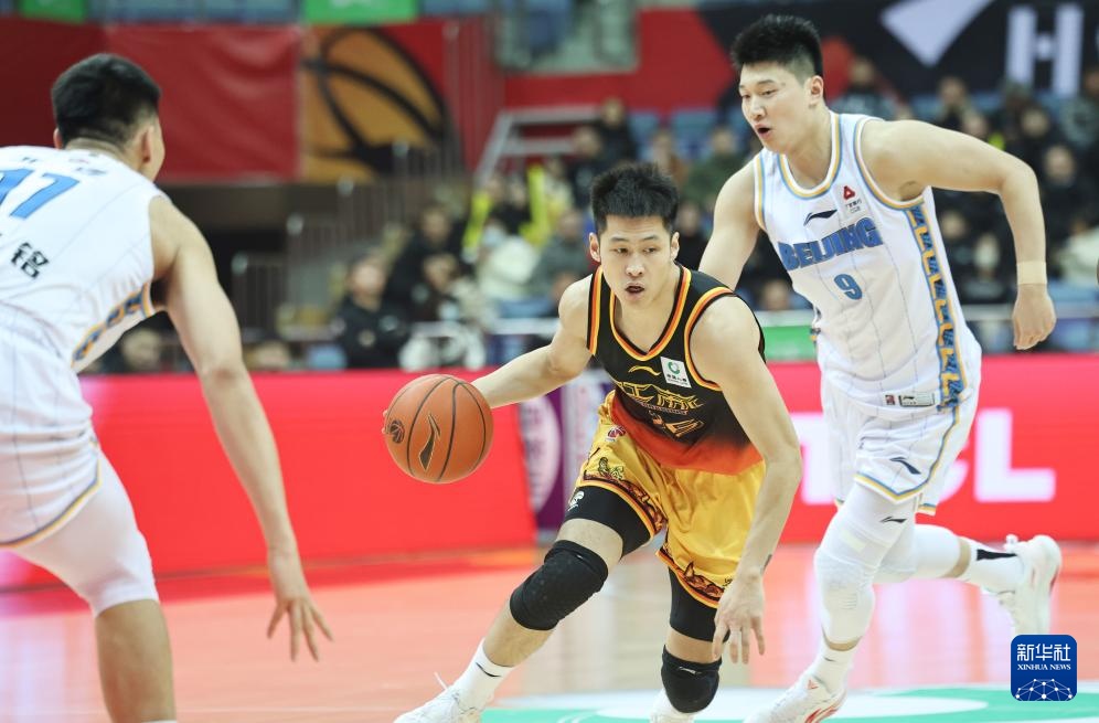 2月3日,北京北汽队球员田宇翔(中)在比赛中带球突破。新华社发(王须中摄)