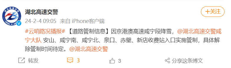 【道路管制信息】因京港澳高速咸宁段降雪,@湖北高速交警咸宁大队 安山、咸宁南、咸宁北、泉口、赤壁、新店收费站入口实施管制,具体解除管制时间待定。