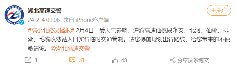 2月4日,受天气影响,沪渝高速仙桃段永安、北河、仙桃、排湖、毛嘴收费站入口实行临时交通管制。请您提前规划出行路线,给您带来的不便敬请谅。
