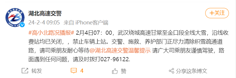 2月4日07:00,武汉绕城高速甘棠至金口段全线大雪,沿线收费站均已关闭,,禁止车辆上站。交警、施救、养护部门正尽力清除积雪疏通道路,请司乘朋友耐心等待@湖北高速交警温馨提示请广大司乘朋友谨慎驾驶,路面遇到任何问题,请及时拨打027-96122.