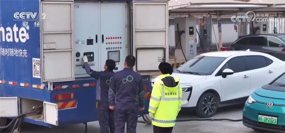 某新能源科技有限公司市场部经理 霍国庆:一次可以保障四台车,一天(一台充电车能充)100多台车次,再带上这边的固定桩,基本上能满足保定服务区使用。