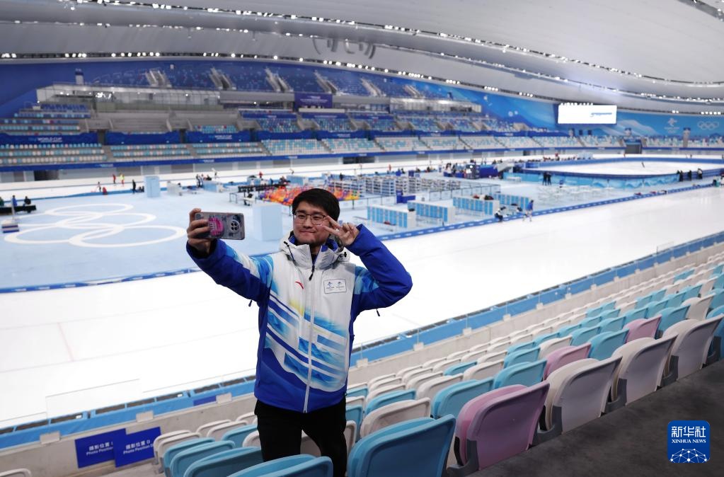 2月4日,北京冬奥会志愿者在国家速滑馆“冰丝带”拍照留念。新华社记者 张晨霖 摄