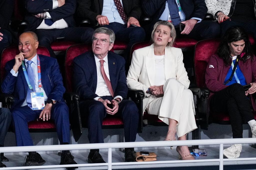 2月3日晚,巴赫(左二)在现场观看跳水混双10米台比赛。新华社记者 杜宇 摄