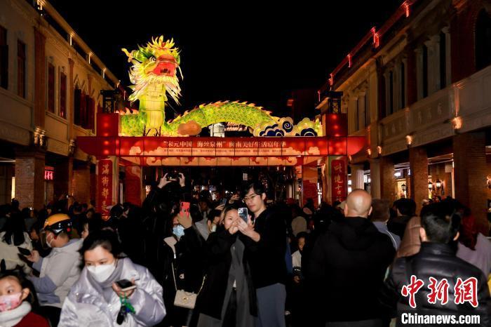当晚,古城龙年生肖艺术装置之“龙鲤鲤大青龙”在泉州中山路正式亮灯。只见“大青龙”头簪刺桐花,口含龙珠,团坐于祥云之上,龙尾则隐藏在金鱼巷内,仿佛穿墙而出,欲冲天飞起,吸引了大量市民游客围观打卡。