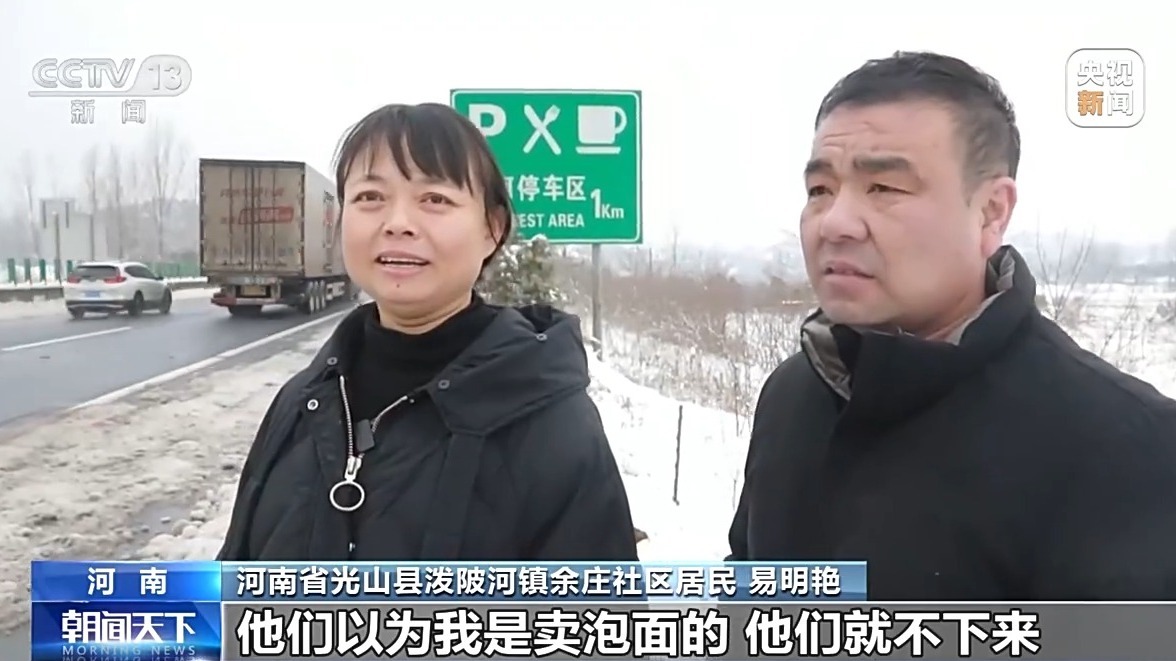 河南省光山县泼陂河镇余庄社区居民 易明艳:我们就打算把这泡面放在这边,有人他们自己要就过来拿,最后我看了不行,他们以为我是卖泡面的,他们就不下来。最后我就翻过去了,挨个敲窗,我说是免费的,我说你们下来,我们是免费的,有热水,下来喝一点热水。