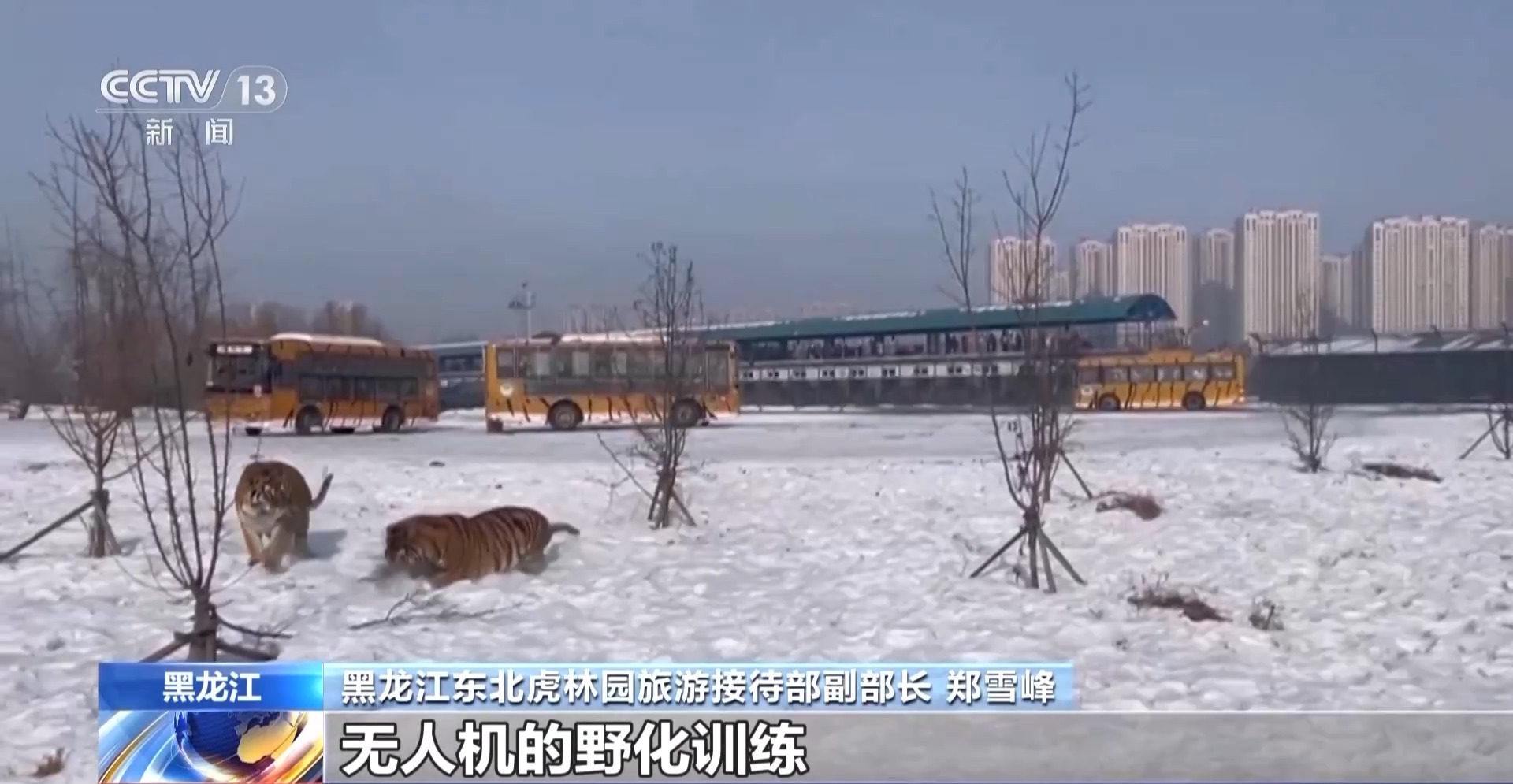 黑龙江东北虎林园旅游接待部副部长 郑雪峰:我们园区每天都会有无人机的野化训练,训练老虎的捕食能力。天气冷也是野化训练的一部分,为了锻炼老虎能在寒冷的天气下更好生活。