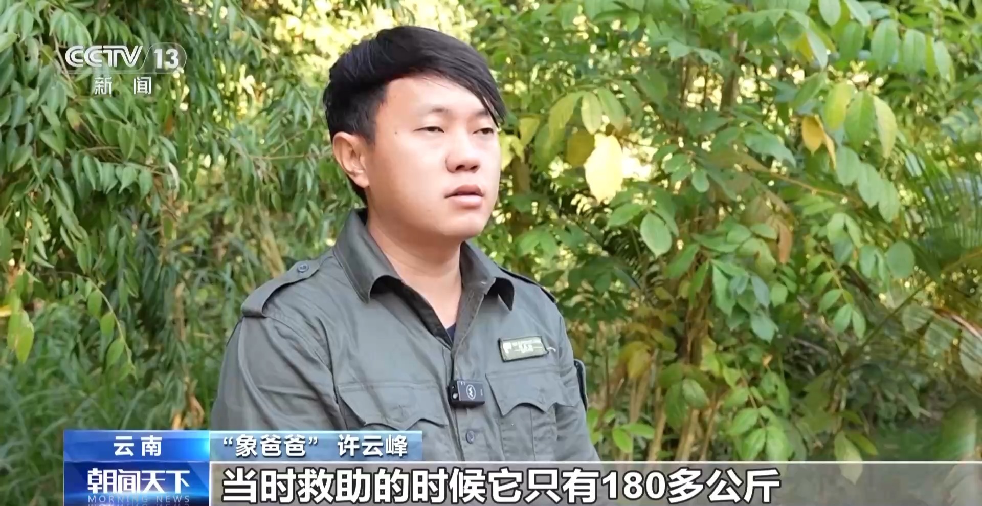 “象爸爸” 许云峰:当时救助的时候它只有180多公斤,经过两年多的时间,它现在已经有一吨多了。