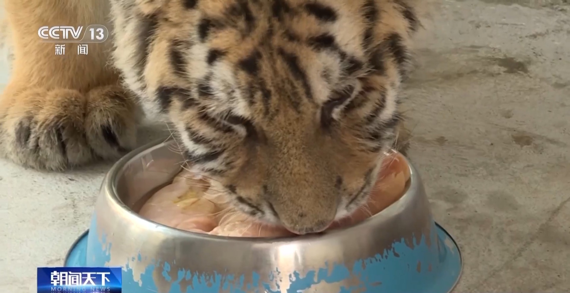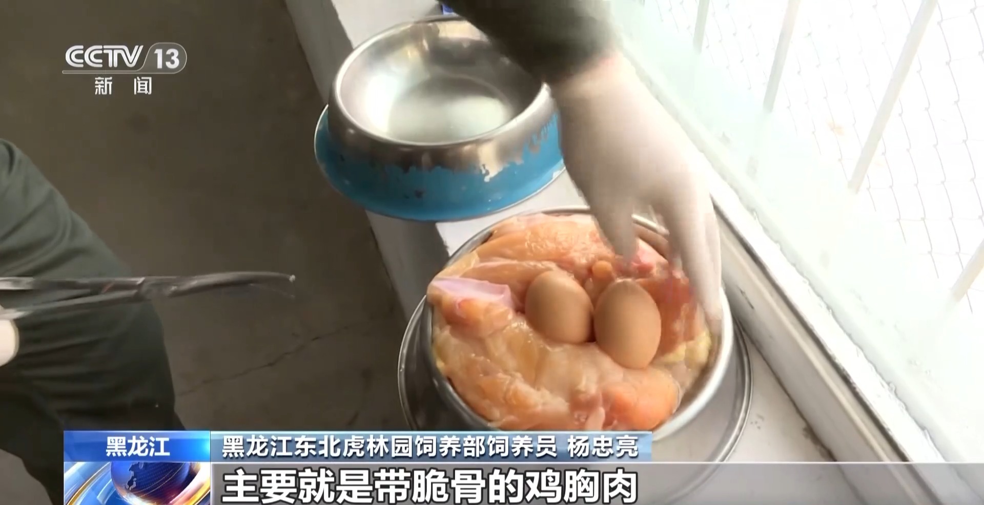 黑龙江东北虎林园饲养部饲养员 杨忠亮:主要是带脆骨的鸡胸肉,每个虎一个鸡蛋,保证它的营养。