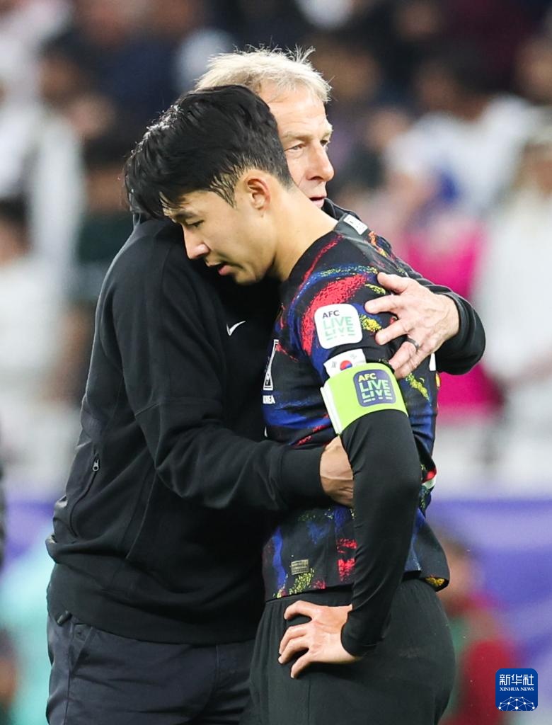 2月6日,韩国队球员孙兴慜(右)与主教练克林斯曼赛后拥抱。新华社记者 丁汀 摄