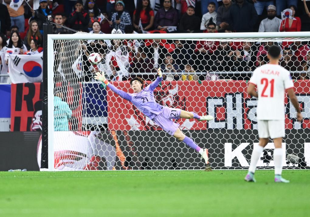 2月6日,韩国队守门员赵贤祐在比赛中扑救。新华社记者 江汉 摄