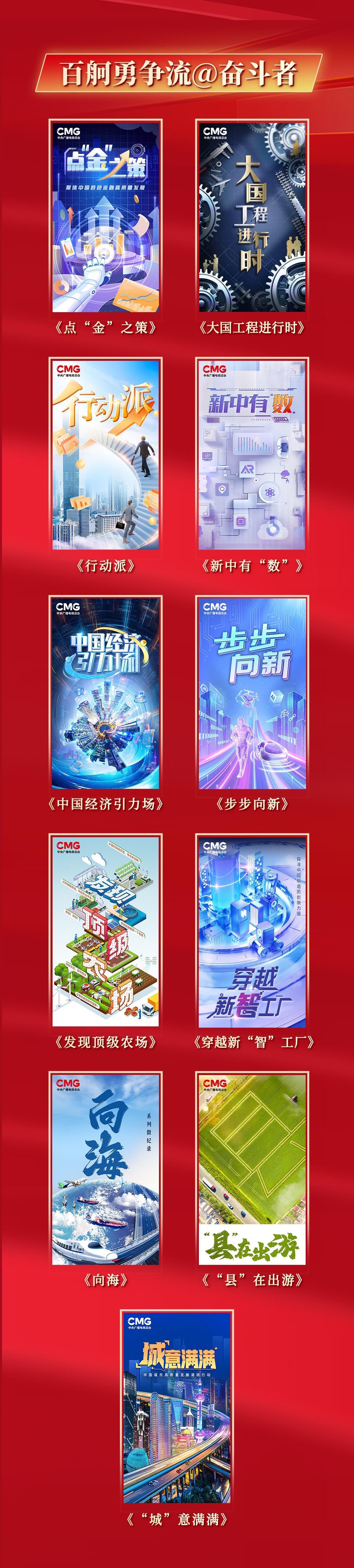 “百舸勇争流”板块聚焦高质量发展,展现各地区各行业开拓奋进的澎湃活力。系列评论《点“金”之策》解析中国特色金融发展之路;融媒体节目《大国工程进行时》报道“十四五”规划中的重点项目,展现中国科技成果和创新动能;系列短视频《行动派》《新中有“数”》《中国经济引力场》《步步向新》呈现各行各业实干奋进的火热图景,“数”说经济运行亮点,阐释中国经济的强大吸引力,反映新质生产力的奔涌蓬勃;新媒体直播及短视频节目《发现顶级农场》《穿越新“智”工厂》解锁现代智能农业体系密码,探寻中国制造的创新力量;系列微纪录节目《向海》聚焦中国企业走出国门、搏击国际市场的努力和实效;系列融媒体活动《“县”在出游》打造中国式现代化县域实践成果交流与传播平台;系列融媒体活动《“城”意满满》呈现青年参与下的中国城市发展新活力。
