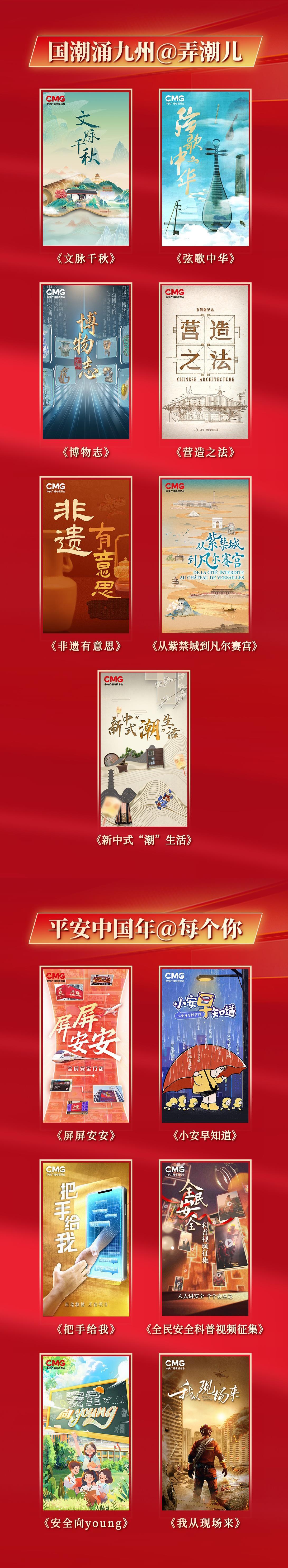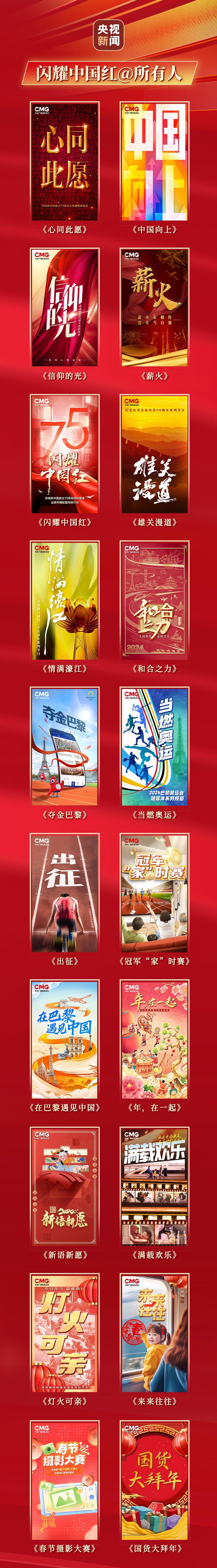 本次片单发布分四大板块。“闪耀中国红”板块围绕新中国成立75周年、红军长征出发90周年、澳门回归祖国25周年等重要时间节点,生动展现新征程上的壮阔图景。融媒体报道《心同此愿》全景式呈现14亿中国人脚踏实地、坚定不移推进中国式现代化的生动实践;系列短视频《中国向上》展现新时代各地各行各业发展成就;系列人物报道《信仰的光》讲述新时代奋斗者的故事;深度访谈《薪火》聚焦新时代科技工作者自立自强、探索创新的奋斗历程;全屏传播联盟特别行动《闪耀中国红》在国庆期间营造热烈的节日氛围;系列节目《雄关漫道》弘扬伟大长征精神;系列节目《情满濠江》讲述新时代澳门的发展新故事;大国外交系列节目《和合之力》阐释中国特色大国外交的担当与作为。2024年恰逢巴黎奥运会,系列报道《夺金巴黎》以首推首发见证中国红闪耀法兰西;短视频《出征》、系列报道《当燃奥运》《冠军“家”时赛》集结奥运赛场内外运动员热血拼搏的励志故事;融媒体活动《在巴黎遇见中国》以奥运热点话题为切口,在巴黎街头搭建线下互动装置,吸引各国友人体验交流。龙年春节即将到来,春节特别报道《年,在一起》《新语新愿》《灯火可亲》带大家体验别样“年味”,向网友送上新春祝福,呈现活力满满的文旅消费和壮美山河;《满载欢乐》《来来往往》记录春运场景,全景展现流动的中国;融媒体互动活动《春节摄影大赛》邀请网友晒出幸福瞬间,《国货大拜年》打造国货潮品的新春消费盛宴。