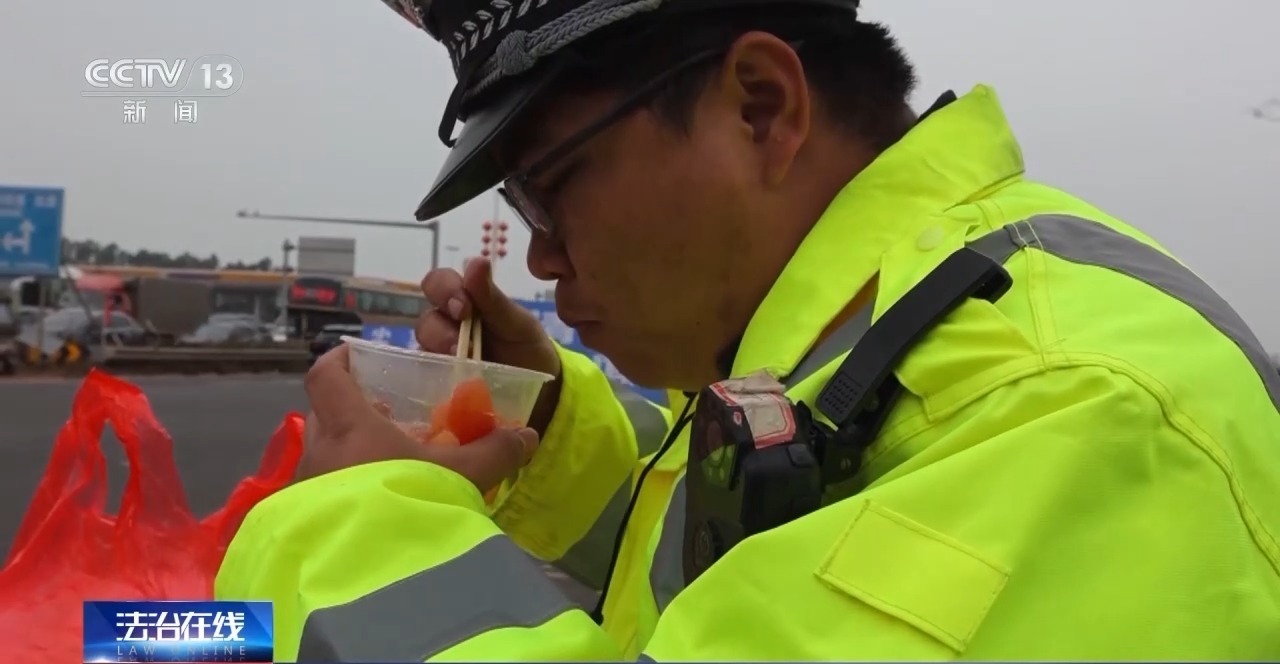 饭菜都凉了,但包长宁和同事却仍然吃得很开心。他们说,习惯了工作节奏后,他们早就没有了抱怨。短暂休息之后,交警们又投入路面巡逻的工作中。