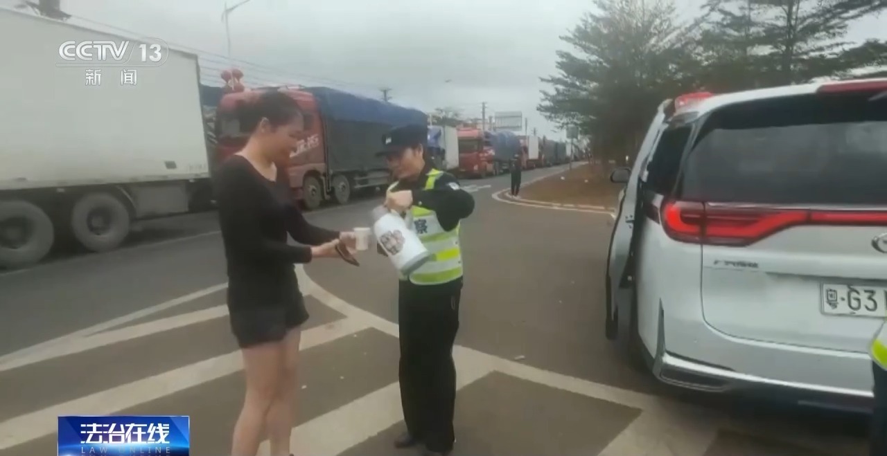 面对路面拥堵,交警们一个接一个的劝阻,可有时也会遇到不理解的司机。为了缓解司机们的焦灼情绪,交警们将准备好的热茶送到现场。