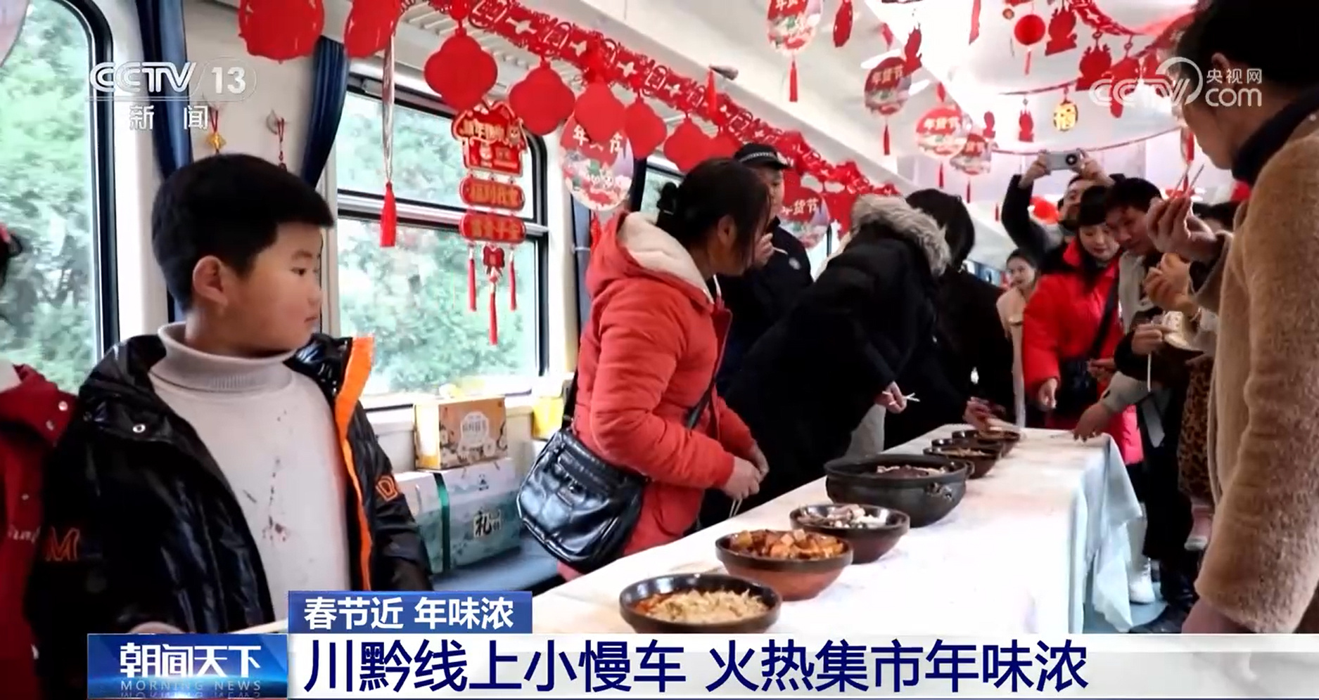 而在我国西南地区,贵州遵义开往重庆的5630次列车上也是热闹非凡,旅客不仅可以在列车上“逛集市”、品尝贵州桐梓“年夜饭”、欣赏非遗文化表演,沿线百姓还能在列车上售卖自家的农产品,采购年货,大家满满都是幸福感、获得感。接下来我们就跟随镜头一起去看看,川黔小慢车上的火热集市。