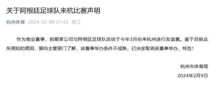 声明表示:“作为商业赛事,前期某公司与阿根廷足球队洽谈于今年3月份来杭州进行友谊赛。鉴于目前众所周知的原因,据向主管部门了解,该赛事举办条件不成熟,已决定取消该赛事举办。”