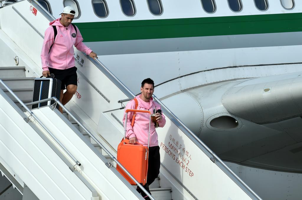 2月2日,梅西与其效力的迈阿密国际队抵达香港国际机场,图为梅西(右)与苏亚雷斯走下舷梯。新华社记者 卢炳辉 摄