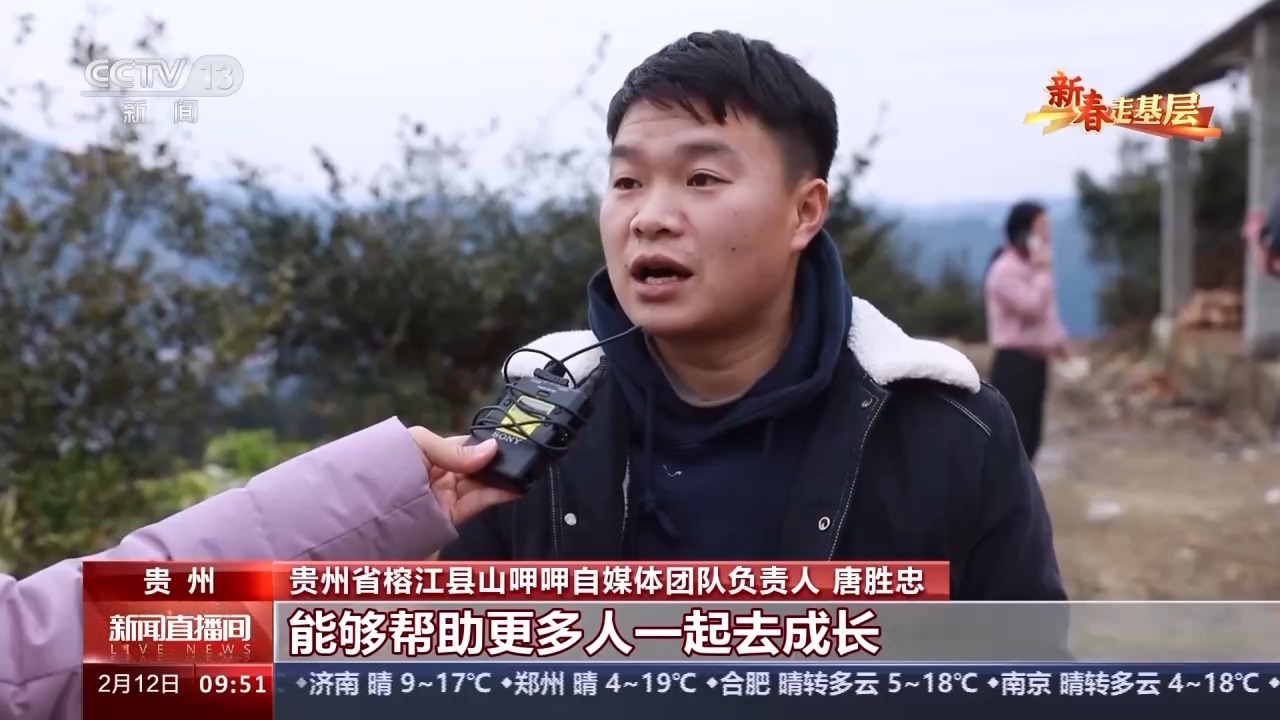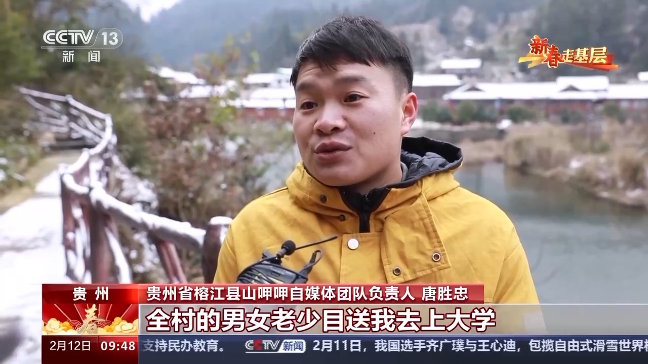 贵州省榕江县山呷呷自媒体团队负责人 唐胜忠:我上大学那时,全村的男女老少目送我去上大学,说实话挺感动的。心里面想着,有朝一日如果自己在外面做得好,总想回到家乡来回报家乡。