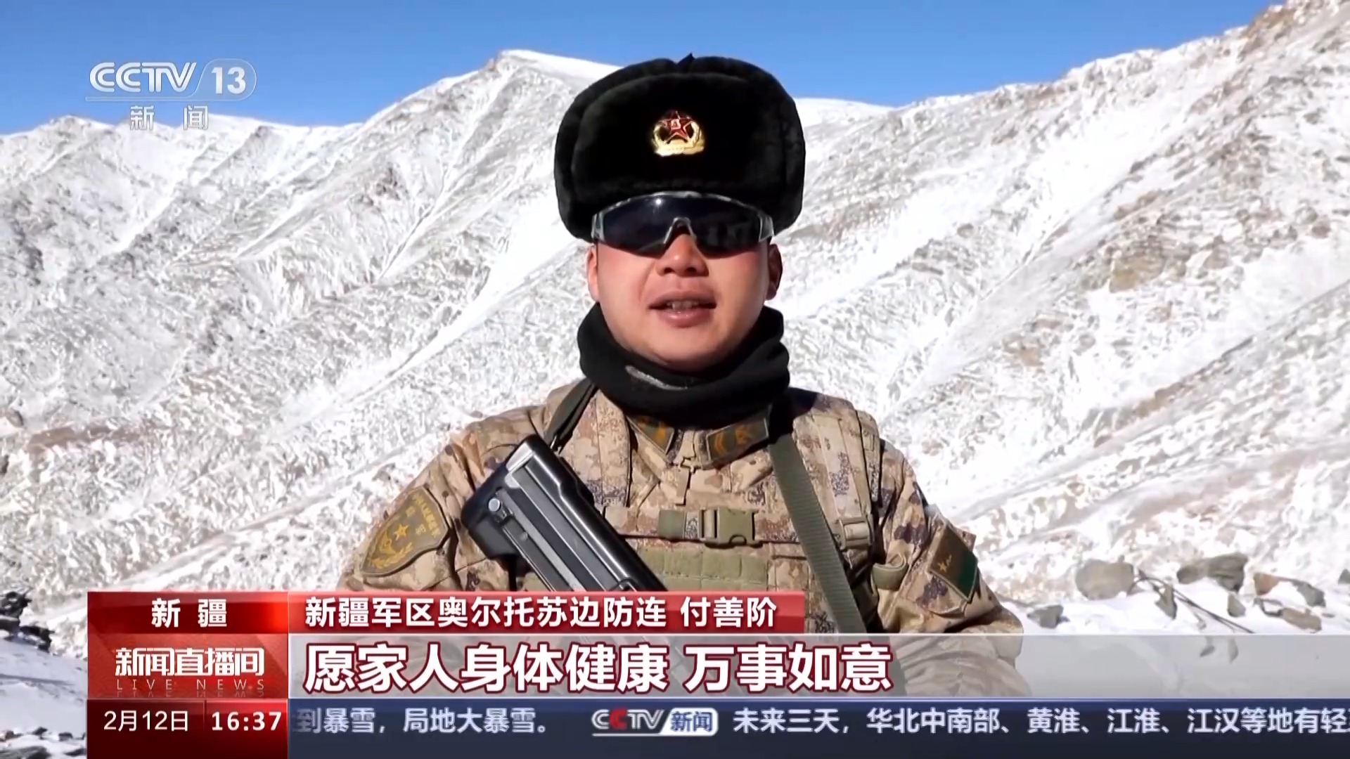 新疆军区奥尔托苏边防连 付善阶:今年是我守防第14个年头。在春节期间,能够再次走上祖国的边防线,我感到很自豪、很骄傲,因为我脚下是祖国,我身后是人民。我一定会守好边、固好防,守好祖国的西大门。