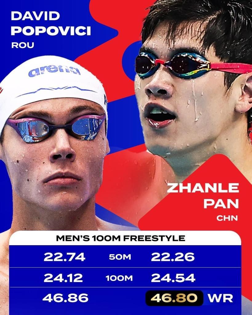 男子100米自由泳被誉为“飞鱼大战”,历来是欧美选手的天下,自2009年由巴西名将小西埃洛创造46秒91的世界纪录后长期无人撼动,直到2022年欧洲游泳锦标赛,罗马尼亚选手波波维奇以46秒86的成绩改写纪录,并在布达佩斯游泳世锦赛摘取100米和200米自由泳两金。