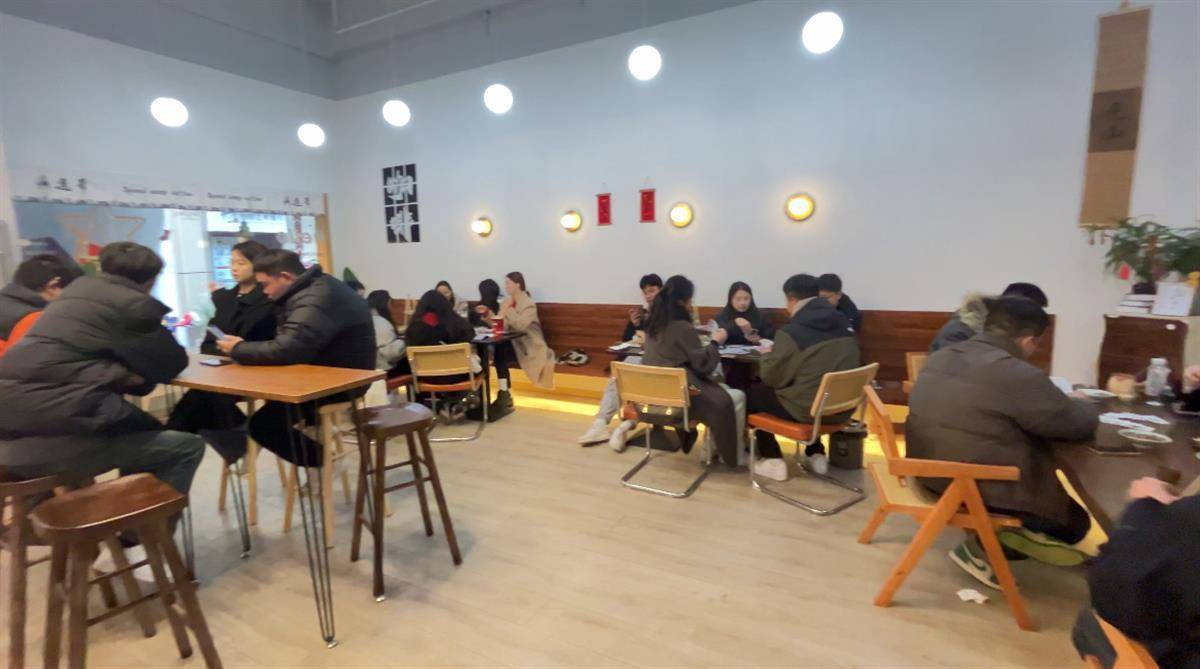 减速带咖啡馆内,冬季推出的围炉烤茶、烤酒、烤奶系列新品吸引着大量年轻人前来聚会。