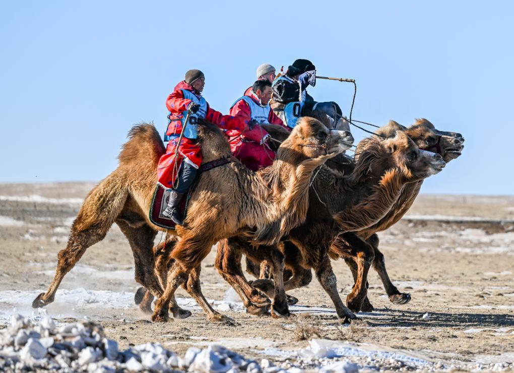 茫茫草原能赛马,茫茫沙漠就能赛骆驼。2023年底在阿拉善右旗举行的阿拉善万峰驼那达慕大会上,设置了骆驼短距离速度赛、长距离耐力赛、接力赛等,还有驼球表演赛。按照当地牧民的说法,赛骆驼就得在冬天,因为冬天的骆驼最漂亮。
