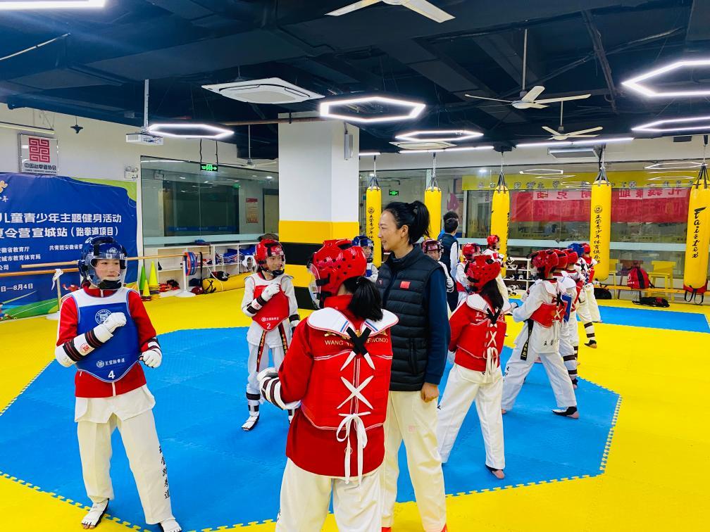 王莹指导跆拳道学员训练。