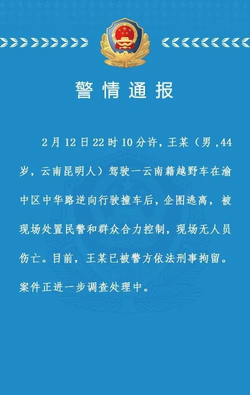 ·重庆解放碑一男子驾车逆行撞车后企图逃离被刑拘,警方通报。