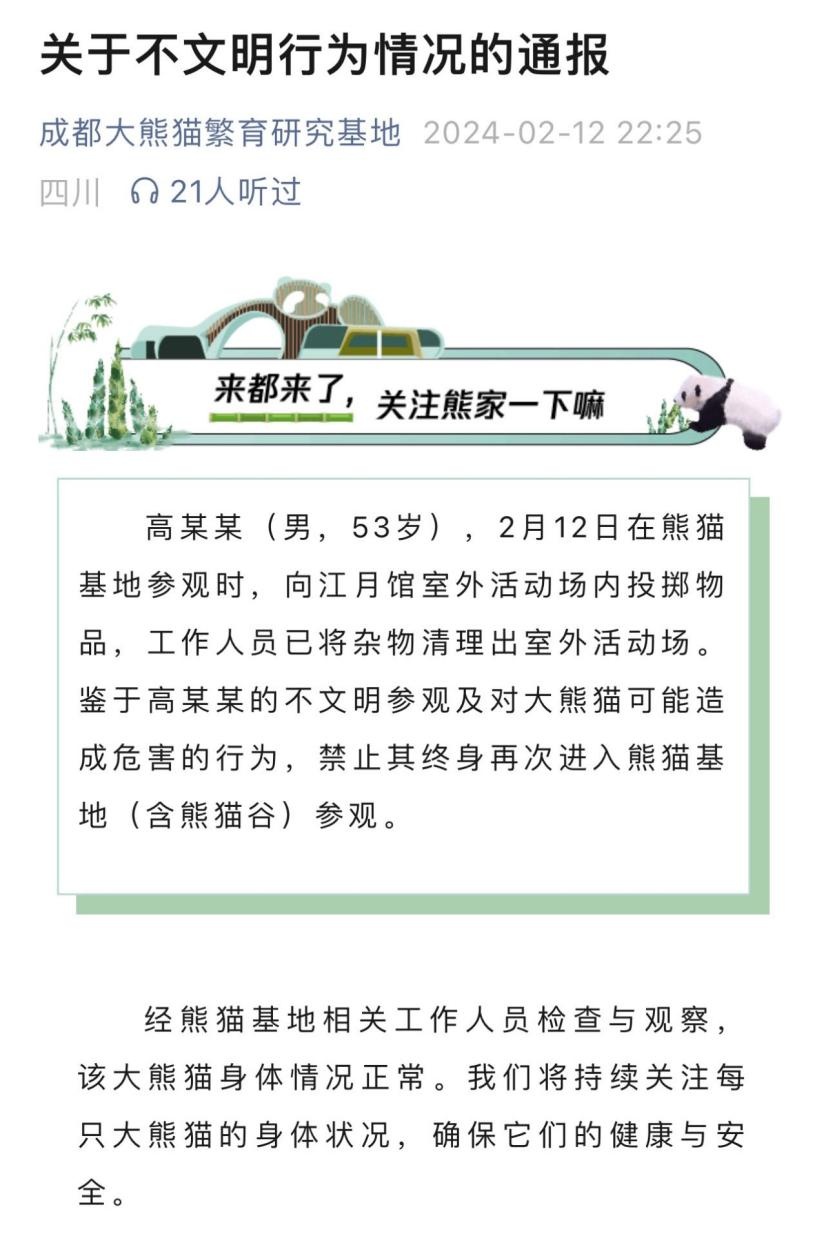 ·一游客在成都大熊猫基地参观时向场内投掷物品,被终身禁入。