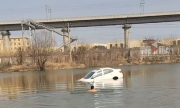 ·江苏南通一钓友忘拉手刹,汽车滑下台阶坠入鱼塘。